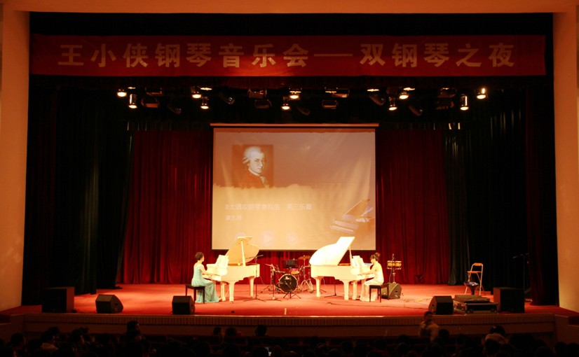 2012年12月4日晚7点,我院音乐系教师王小侠在科艺苑成功举办了王小侠钢琴音乐会。在此寒雪飞扬的初冬之夜,由我院教师王小侠主演的音乐会于晚上7点缓缓拉开序幕,此次别开生面的钢琴表演,以双钢琴独特的艺术表现能力,特邀了弦乐队、架子鼓、贝斯、邦戈鼓等乐器的配合演出,使音乐会高潮迭起,最后以一首配有精美MV的THE DAWN 将音乐会推向了全场的最高潮,在场观众反响热烈,音乐会在热烈的掌声中完美的落下了帷幕。