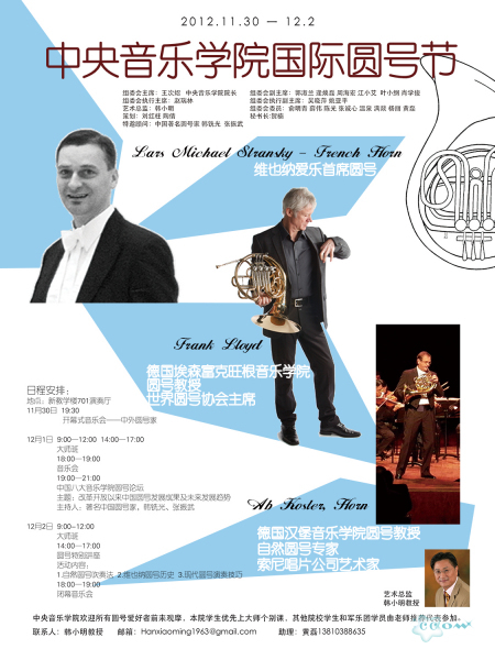 此次国际圆号节策划、艺术总监由著名德籍华人圆号演奏家、德国萨尔布吕肯音乐学院圆号教授韩小明先生担任。特邀国际圆号协会主席、德国埃森音乐学院圆号教授弗朗克.罗伊德,德国汉堡音乐学院自然圆号专家终身圆号教授Ab Koster,维也纳爱乐乐团圆号首席LarsMichael Stransky等三位大师参加。