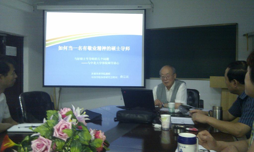 曲教授是中国学校体育理论的泰斗,他创立了中国学校体育学。从国家教委退休后,一直关注中国学校体育的发展,曾多次来beat365指导工作,是学院的老朋友。他不辞辛劳,为我院新增的硕士生导师作指导报告,以其渊博的学识,新颖的观点,诙谐的语言,生动的肢体动作,忧国忧民的高尚人格魅力,成为年轻硕导们学习的楷模。